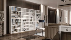 Книжный шкаф Chandra с белой лакированной отделкой, с латунными ножками и ручкой дополняет обстановку, сохраняя при этом строгий и элегантный стиль гостиной.