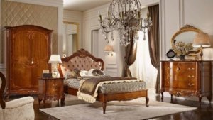Спальня может очаровать и покорить любого ребенка своим классическим стилем Casa Principe. В спальне, полностью выполненной в нежных тонах, расположен большой двустворчатый шкаф с лакированной отделкой и золотой резьбой.
